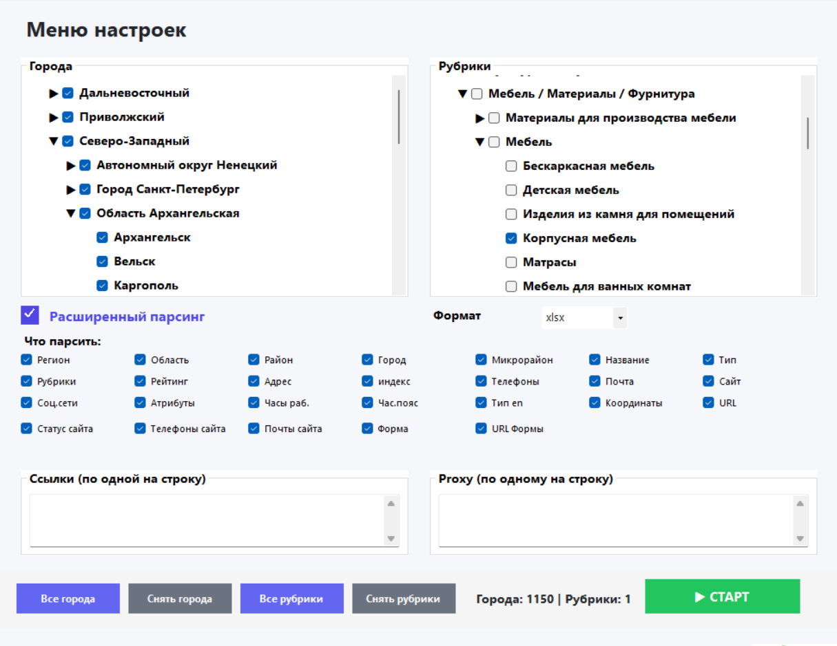 2 вида парсинга: С общедоступного каталога организаций и расширенный режим ( Advanced ) -> Дополнительный сбор данных напрямую с сайтов компаний.